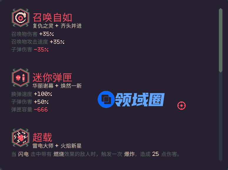 提供的七种枪械在射击速度,装弹量,攻击伤害甚至是换弹时间上均有所差异。升级技能则围绕射击这个玩法,进行了大量定制化设计,除了射速,伤害,范围等常规属性提升外,像是杀怪越多,换弹越快的特殊技能也比比皆是。