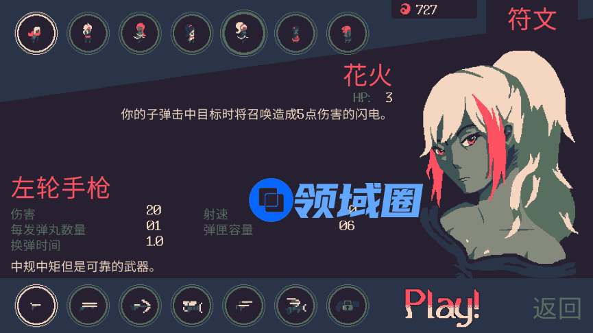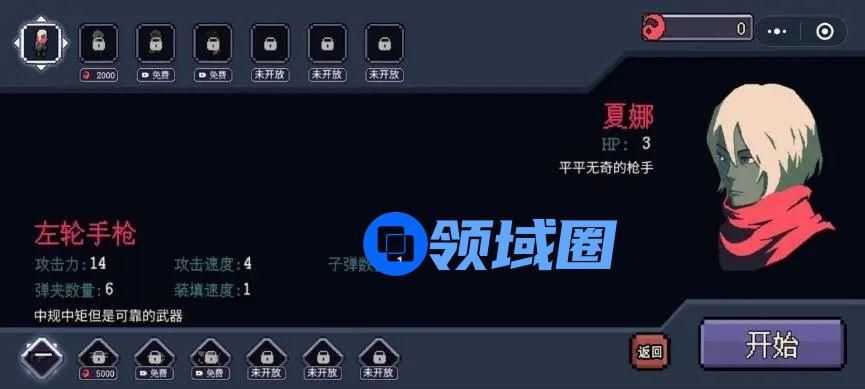 围绕射击功能,开发者flanne在人物角色,枪械属性以及升级技能上做了不少文章。每个人物除了外观不同外,还拥有不同的初始技能和血量。