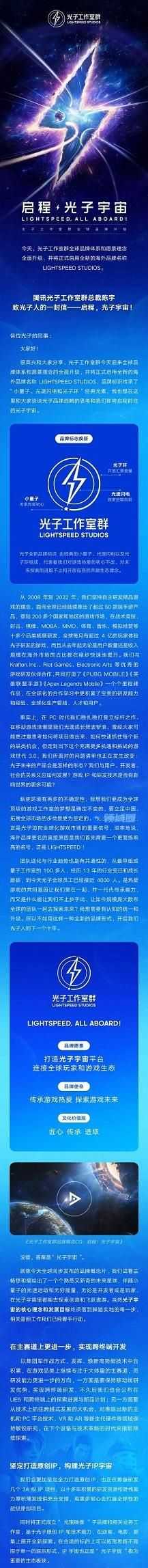 今天上午,腾讯集团副总裁、光子工作室群总裁陈宇发布了一封公开信,宣布光子将启用新的海外品牌:LIGHTSPEED STUDIOS,并提出了新的Slogan:「启程,光子宇宙」。