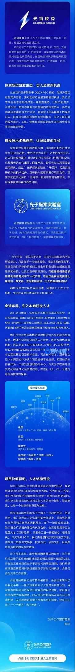 2. 打造原创IP,构建光子IP宇宙。光子目前正在筹备几个3A级别的IP,未来还将面向全球打造新的超级原创项目。同时,他们也将成立「光宙映像」子品牌和相关业务工作室,探索动画、影视、剧集等新的内容形式。