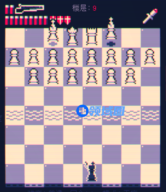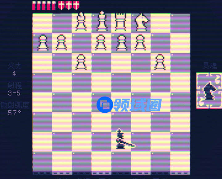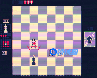 除了玩家这边有着一些特性之外,电脑的白色方也有一些特性,最关键的就是给不同的棋子赋予了不一样的血量;行动缓慢但最多的士兵只有三点血,也就是玩家在近距离可以一枪解决掉的血量。行动较快的马也只有三点血,和士兵一样;行动不算快,但是拥有较大攻击范围的相有四点血,大多数时候相的职责更多是限制玩家的行动范围。行动迅速攻击范围巨大的车拥有五点血,这让玩家遇上之后会较为棘手,所以一般车也不会提前的进入战场。国王拥有最多的血量八点,玩家所要思考的就是在有限的子弹和最短的步数消灭八点血的国王,这一套系统就构成了《霰弹国王》最底层的博弈。