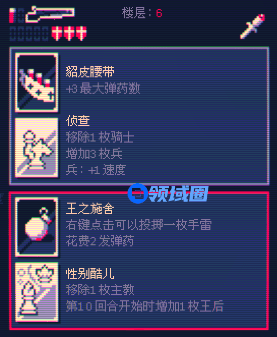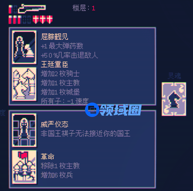 虽然有了以上的一些对传统象棋的解构,但如果只是这样那也只是浅尝辄止;上文中我也提到《霰弹国王》是一款Roguelite的游戏,而游戏中的随机元素来自于每局结束后二选一,选择两组效果中的一个,每组效果中分为两个BUFF,一个是强化玩家,另外一个是强化AI。