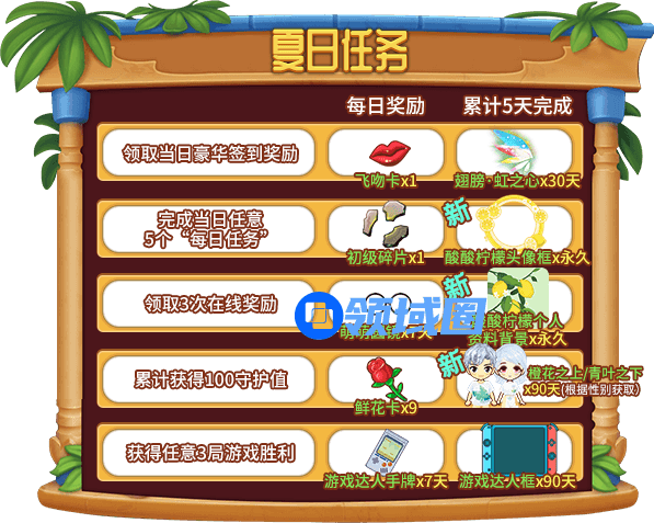活动期间,完成夏日任务,领取特别奖励!当同一个任务累计5天都完成时,我们还会按照派对的规定,给予您更加丰厚的奖赏!
