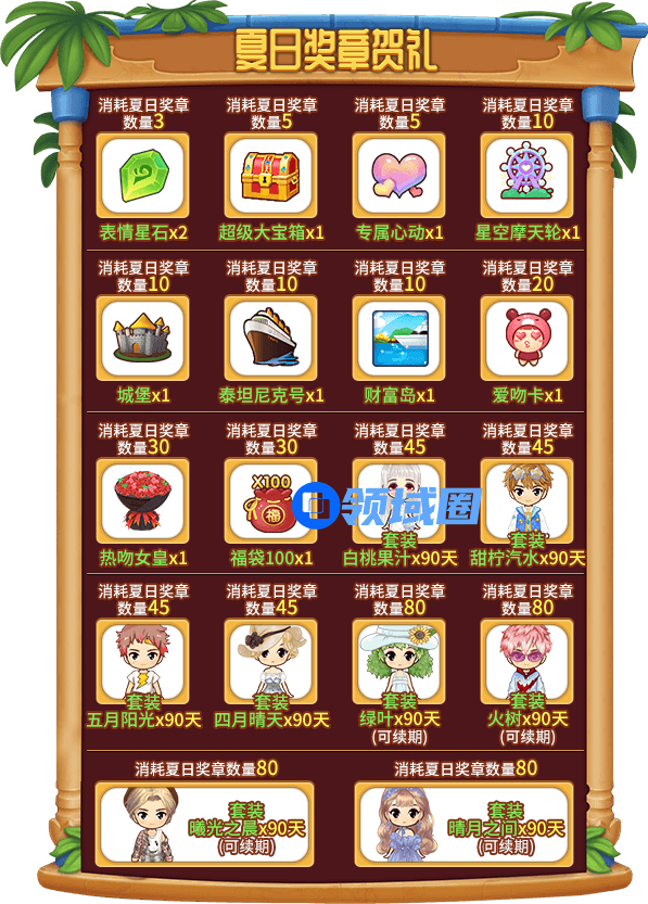 累计消费10000金币后,每额外消费1000金币,即可获得一份“夏日奖章”,使用“夏日奖章”兑换特别奖励: