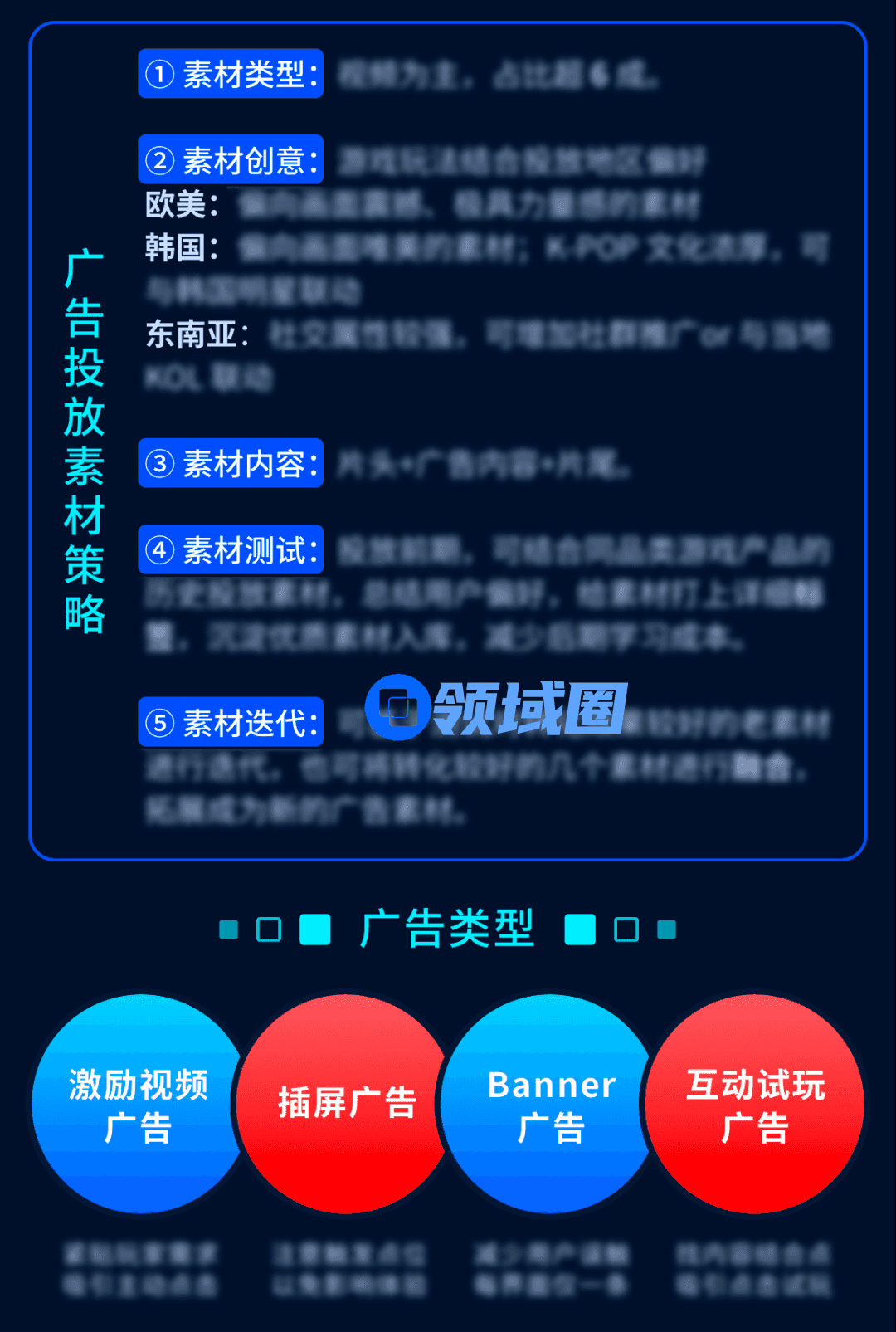 还有游戏出海的重中之重,买量!出海买量一直是厂商们面临的一大挑战,海外玩家与国内玩家的习惯、喜好不同,未经斟酌的买量方式难以被海外玩家接受,效果很难达到预期。攻略总结了四大类广告投放渠道,并从广告投放素材的类型、创意、内容、测试和迭代五大维度提供了策略,以及针对四大广告类型的点位设计要素提出了有效建议,辅助游戏出海攻克买量难题。