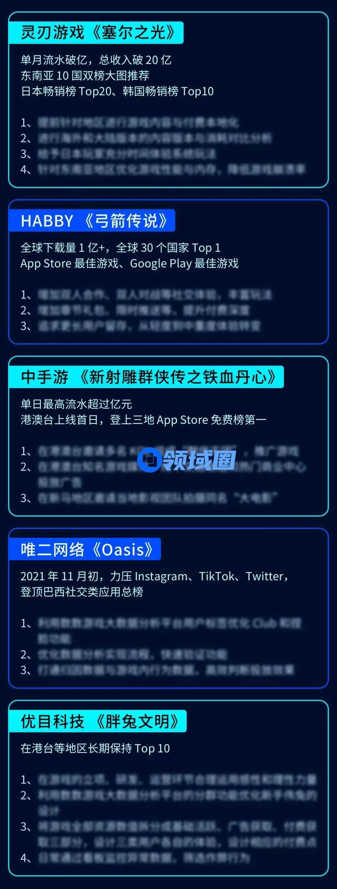 除以上,我们还根据多个爆款出海游戏项目组的采访分享,包括灵刃游戏《塞尔之光》、HABBY《弓箭传说》、中手游《新射雕群侠传之铁血丹心》、唯二网络《Oasis》、优目科技《胖兔文明》,梳理了他们的出海发行和运营思路,逐条列出,一并打包成了经验合集。从爆款中学习,到成为爆款。