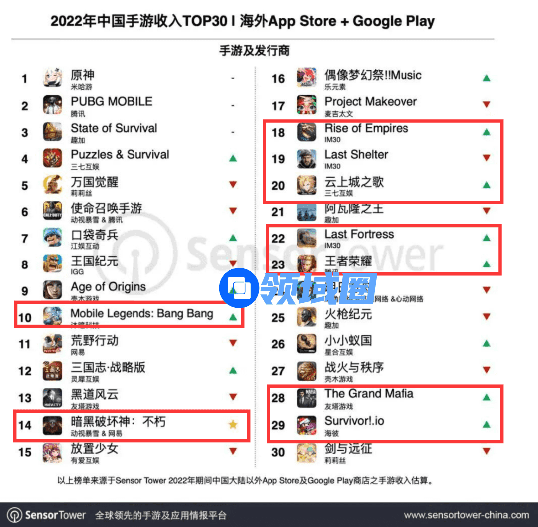 在2022年手游出海收入排行榜TOP30,新晋榜单的9款产品也大都来自腾讯、网易、三七互娱、沐潼、龙创悦动等出海大厂。仅有海彼游戏出品的《Survivor!.io》靠着大热的“割草”玩法休闲化成功突围,成为2022年手游出海市场上的一匹黑马。