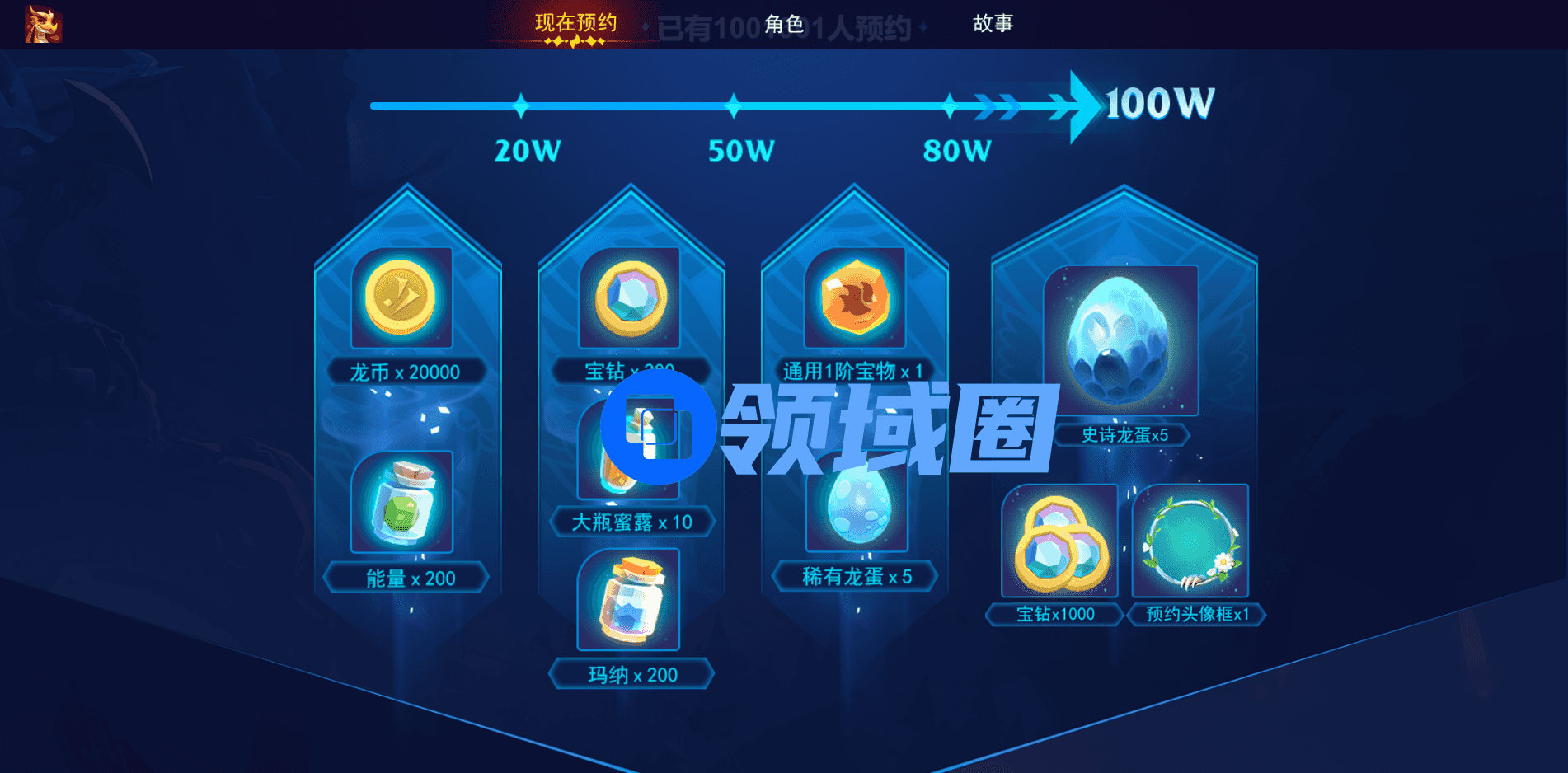 即日起在官网进行预约,必得技能提升资源*30、史诗龙蛋*1、宝钻*200,官网预约人数此刻已超百万,还将在正式上线后发放以下道具:技能提升资源*3、史诗龙蛋*6、宝钻*1400、龙币*20000、能量*200、大瓶蜜露*10、玛纳*200、通用一阶宝物*1、稀有龙蛋*5、预约限量绝版头像框*1