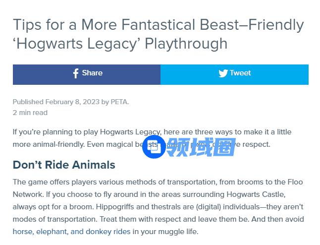 据了解,《霍格沃兹之遗》在发售2周之内狂售1200万套,甚至超越了去年同期的《艾尔登法环》的销售速度,成为今年当之无愧的爆款游戏。不少玩家认为,在这个时候PETA突然发布这种毫不相关的文章,明显是在蹭游戏的热度。