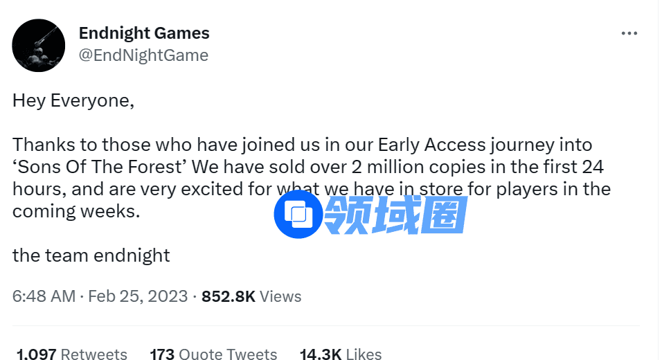 24小时,200万份销量,这是《森林之子/Sons Of The Forest》抢先体验版发售首日交出的答卷。