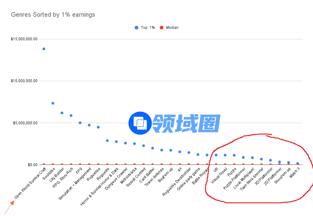Steam各品类头部游戏(1%)的收入