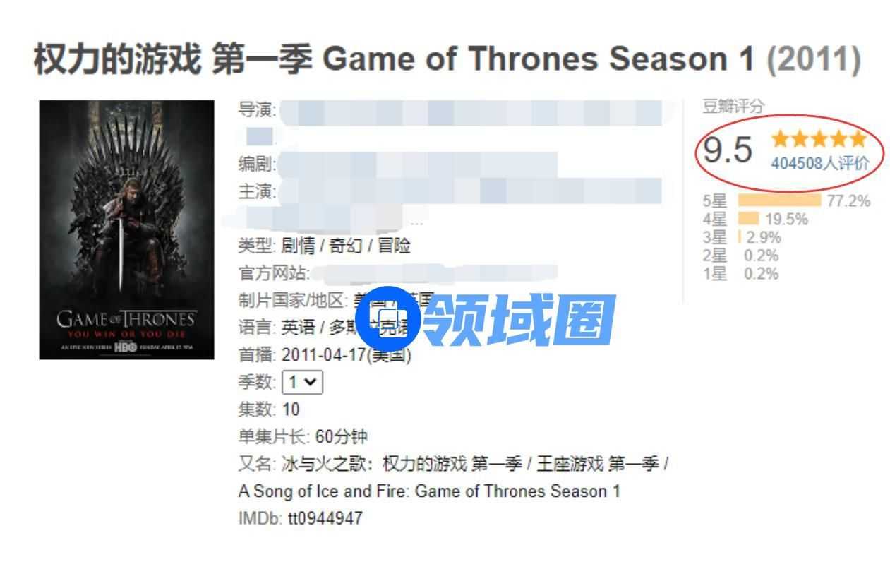 在国内,权游也有自己忠实的粉丝群。在豆瓣上,超过40万人为本剧的第一季打分不说,豆瓣评分甚至达到了9.5的高分,妥妥的豆瓣神剧!