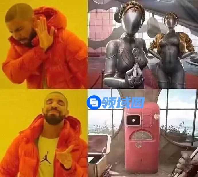 我原本以为这就已经是《原子之心》的极限,然而万万没想到官方还藏了一手。在游戏发售后不久,某天深夜某位友人悄悄的给我发了一段神秘信息“诺拉太烧了”,下方还配了一张粉红冰箱的图片。起初我还以为这位友人又觉醒了什么奇怪XP,直到第二天铺垫盖地的“电子魅魔”梗图出现,我才意识到我太单纯了。