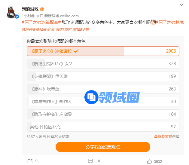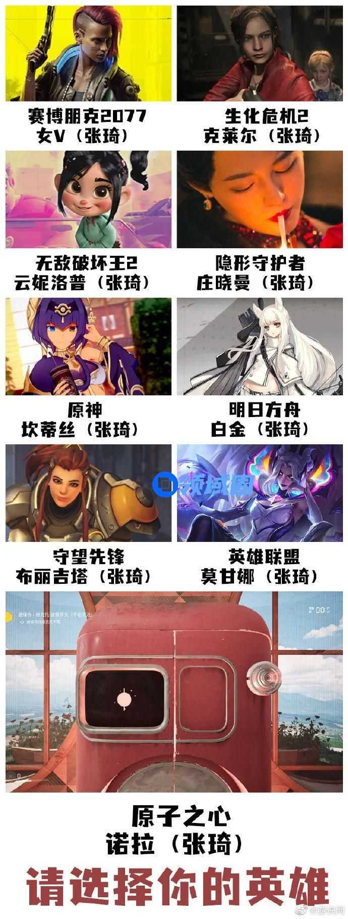 微博上也发起了一个张琦老师配过的角色投票,粉红冰箱拳打《赛博朋克2077》女V,脚踩《原神》的坎蒂丝,以碾压之势高居榜首,再次验证了广大网友的XP独到。