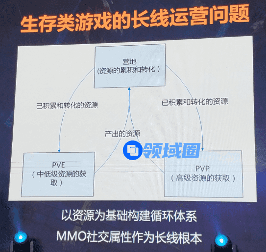 《明日之后》制作人曾在2019年的网易游戏开发者峰会复盘游戏立项过程,提到《明日之后》作为生存游戏在资源循环的核心玩法之上,实现长线运营的关键在于——引入成长和社交。这两个功能主要通过营地实现。