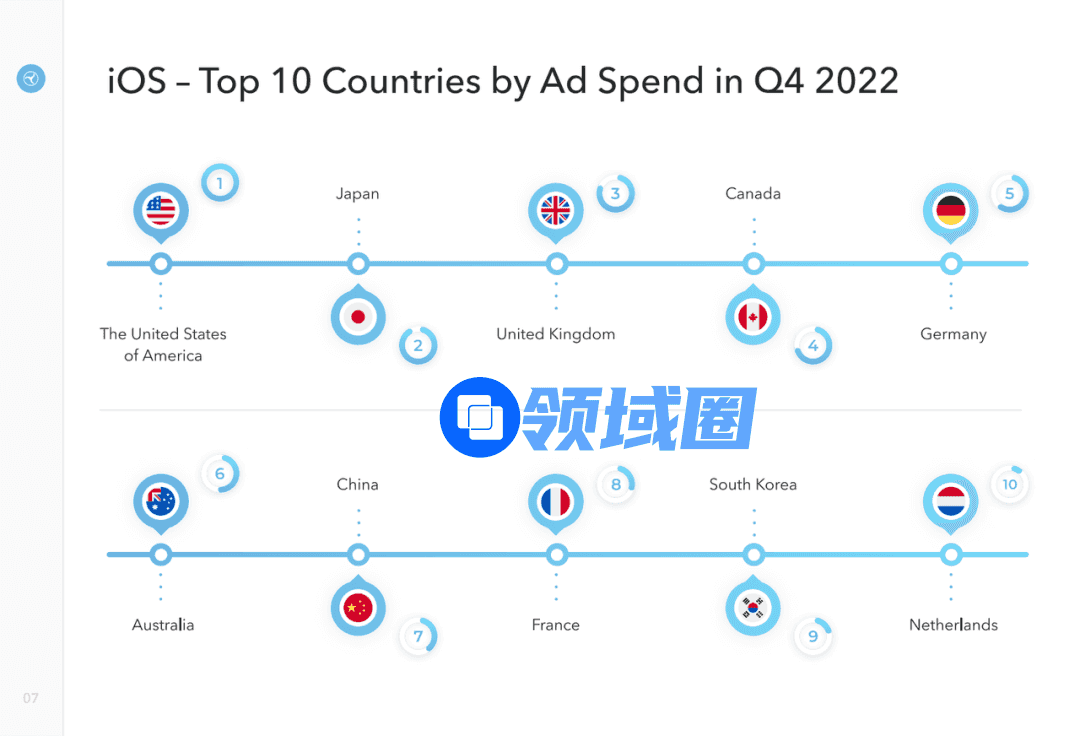 聚焦区域市场,美国依旧是最热、最贵的 IAA 买量市场。除了首次挺进 iOS 榜的荷兰,全球 Top 10 广告投放支出榜的入围国家与上版名单基本一致。