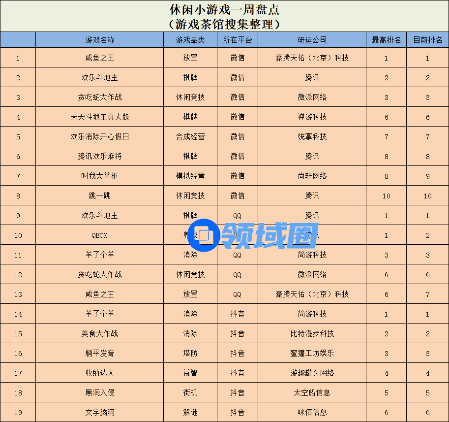 休闲新游周报每周统计微信小游戏、QQ小游戏、抖音小游戏、硬核小游戏以及App Store和Google Play上的新游爆款,并按照分类制作表格,将游戏排名情况等信息公布,希望给到行业同侪帮助。