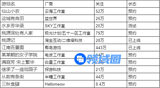 目前从搜索到的古风模拟经营游戏来看,仍有大量还未实际上线的游戏。从目前已经上线的游戏来看。它们的画风多以水墨风为主,从玩法来看,除了经营领域不同,更杂糅解谜、策略等各种玩法。也不乏画风亮眼的强力竞争者加入。如《桃源深处有人家》,由五十一区开发,并由极光计划发行,目前已有81万预约。
