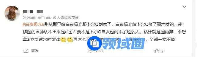 显然,“卜尔Q”的这张情人节贺图是商业约稿,“卜尔Q”发布的是自己草稿,而官方发布的则是由美术组细化后的版本,这也直接把“卜尔Q”进一步推上了风口浪尖。言外之意,你小子不仅使用AI,甚至还敷衍的把AI图交给官方细化,这直接导致《白夜极光》也因此遭难,不少人认为官方是否在纵容画师使用AI,伤害玩家感情。