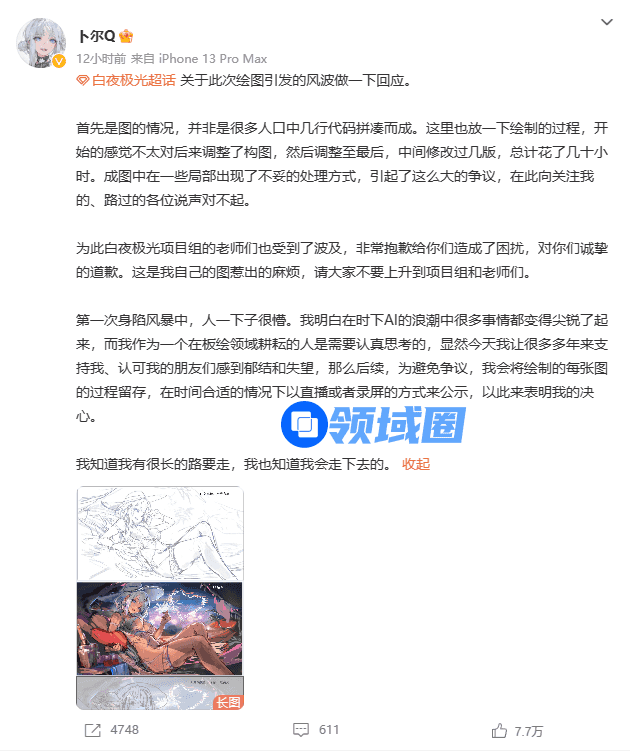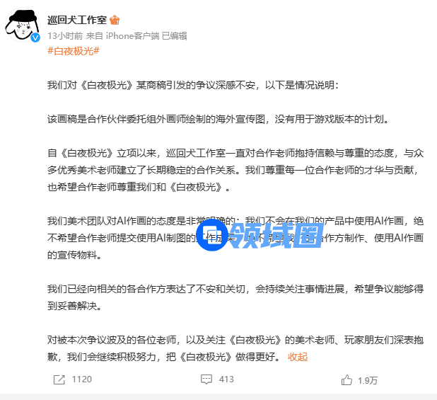 就这样,没有国服的《白夜极光》难得上了次热搜。最终,在今天凌晨“卜尔Q”和《白夜极光》的研发方巡回犬工作室相继发布了声明。身处话题重心的“卜尔Q”聊了很多,没有明确否认使用了AI进行商业创作。