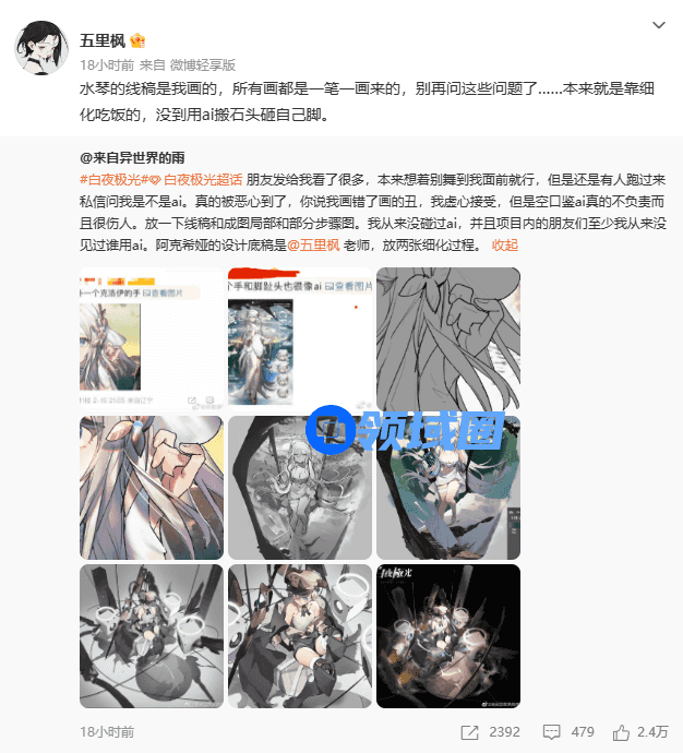 ”阿克希娅”的底稿画师也现身认可了该说法,并表示本来就是靠细化吃饭的,没到用AI搬石头砸自己脚的时候。