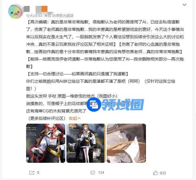 而前面那位信誓旦旦指出“海蒂"是由AI画的垃圾的网友呢?在那之后没多久,这位网友就在微博表示自己“判断错误”,一股脑地发表个人看法没想到后续会引发这么大的讨论和冲突,已经通过私信向画师本人道歉,表示真心希望游戏变好。(滑稽