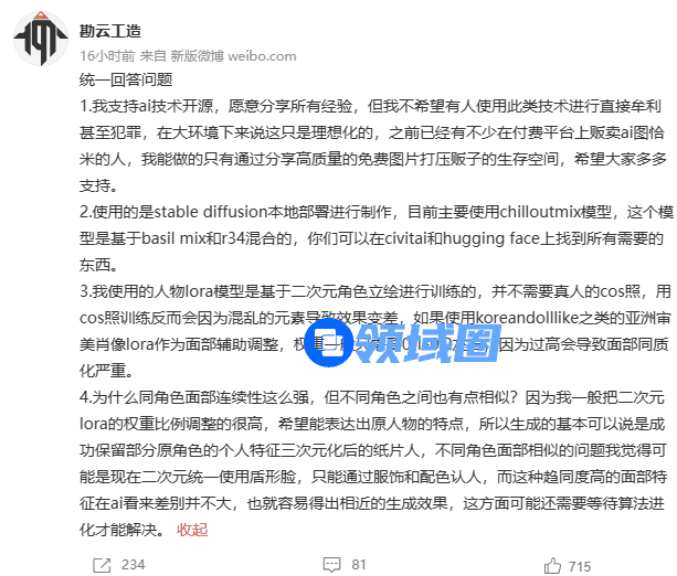 因为AI作图的一系列热点,“勘云工造”也恰好在昨天对网友的问题进行了统一回应。简单来说,他本人支持AI技术开源,但不希望有人使用次技术进行直接牟利甚至犯罪,而他也承认这在目前的大环境下是理想化的。