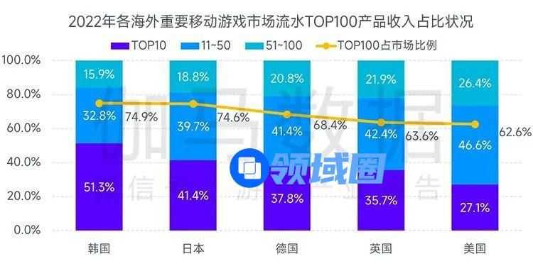 在海外市场,美、日、韩、英、德五国仍是全球移动游戏市场的重要组成部分,全球移动游戏营收中超五成来自于这五国市场。受不同的地域文化、用户习惯、市场发展进程等因素影响,各国市场展现出了不同的特征。从流水TOP100游戏收入占比来看,韩国与日本相比其他海外其他市场具备更高的集中度,其中韩国TOP10游戏收入占TOP100产品总收入的五成以上。