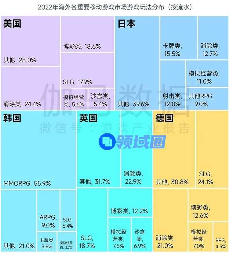 各国市场下用户玩法偏好明显。美国、英国、德国等欧美市场中流水排名前三的玩法类别均为消除类、博彩类与SLG,轻量型的游戏玩法有利于覆盖更多用户,而随着用户数量与游戏经验的积累,对于游戏多样性的需求也不断萌发,也因此发展更为成熟的美国市场对休闲游戏多样性需求的推动作用更为明显;日本市场对于更易与二次元题材结合的卡牌类偏好更强;而韩国市场受韩国企业品类研运经验、IP优势、用户习惯等因素影响,偏好玩法更集中于MMORPG,该品类贡献了市场收入的五成以上。