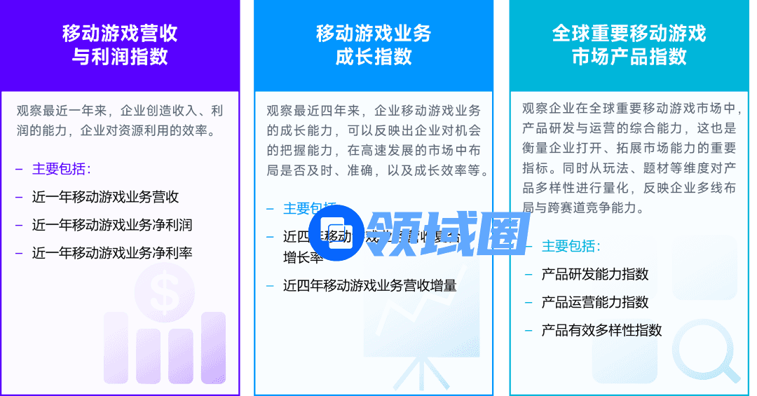伽马数据以中国企业在全球重要移动游戏市场的表现为依据,建立竞争力模型。包括但不限于以下几个维度进行评估: