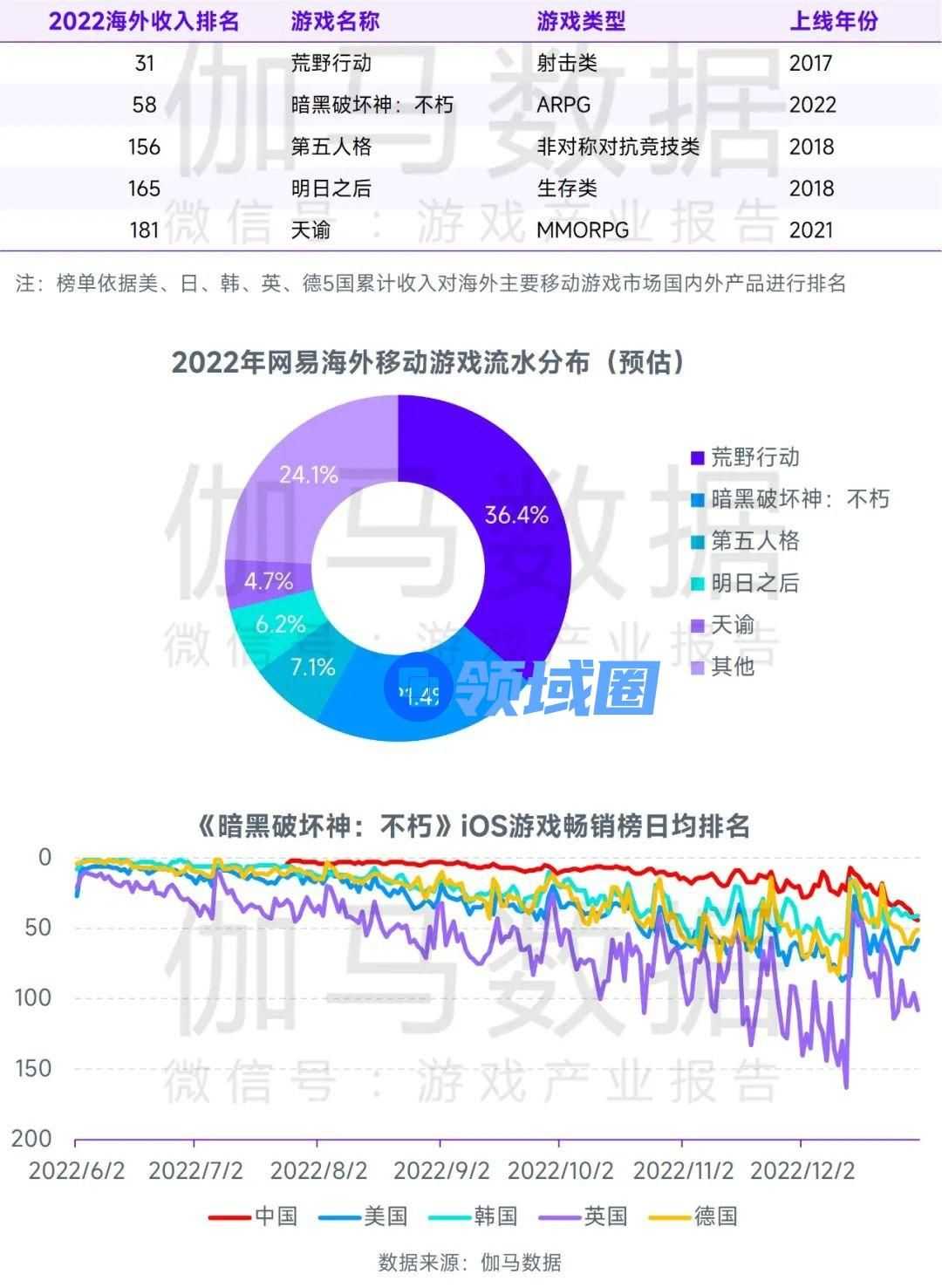 与在国内市场类似,网易游戏在海外市场上同样进行多线布局。2017年推出的《荒野行动》让网易游戏在全球市场内占据了战术竞技类游戏的头部位置,并在多年时间中为网易游戏带来稳定的海外收入,2022年内,《荒野行动》仍是网易游戏海外市场的营收主力,其流水占网易游戏海外收入的三成以上。而2022年推出的新游《暗黑破坏神:不朽》为网易游戏打开了海外ARPG市场,在网易游戏自身研发实力与“暗黑破坏神”IP的结合下,在2022年6月全球上线后的半年时间中,《暗黑破坏神:不朽》便跻身海外主要市场移动游戏收入排行TOP100,更是2022年主要海外市场自研移动游戏流水TOP20榜单中的唯一新游。