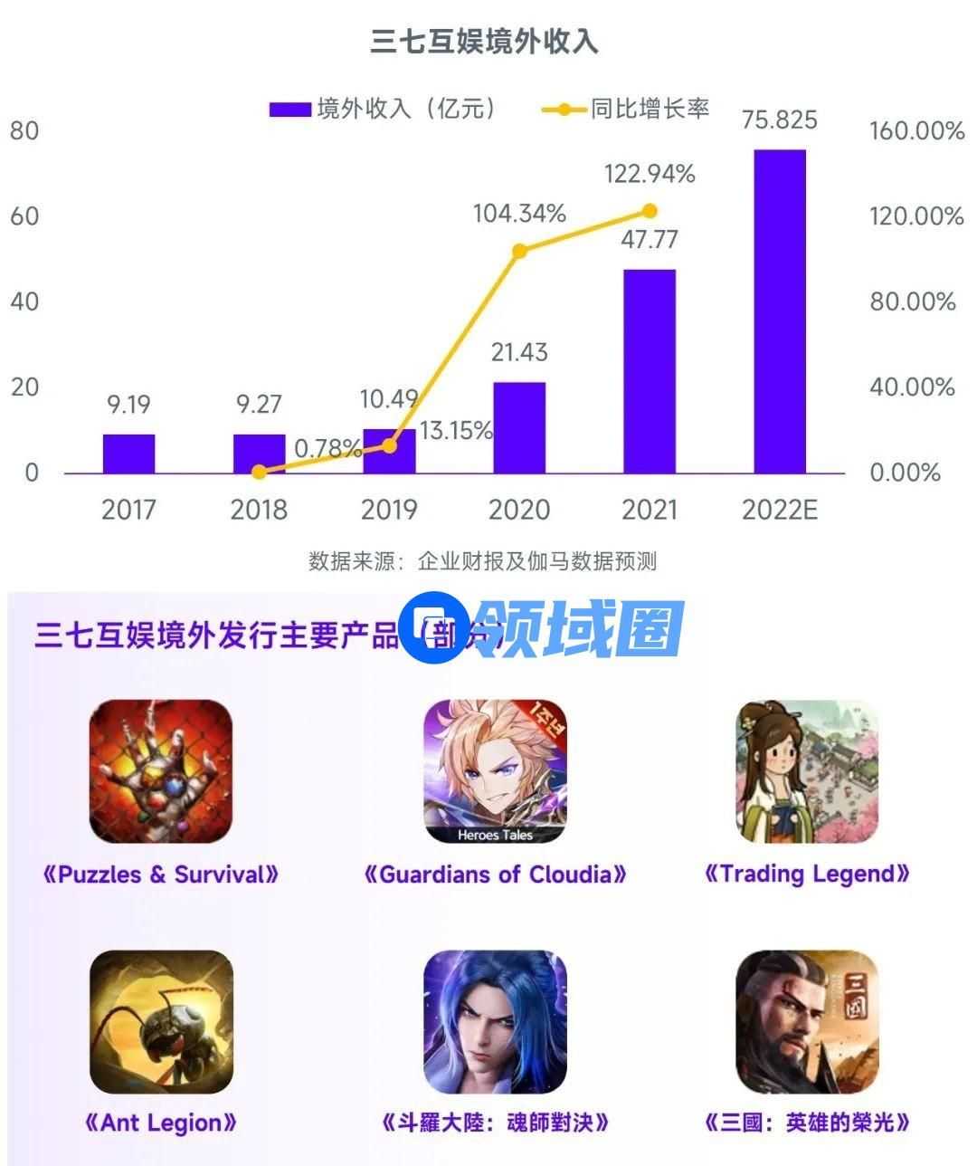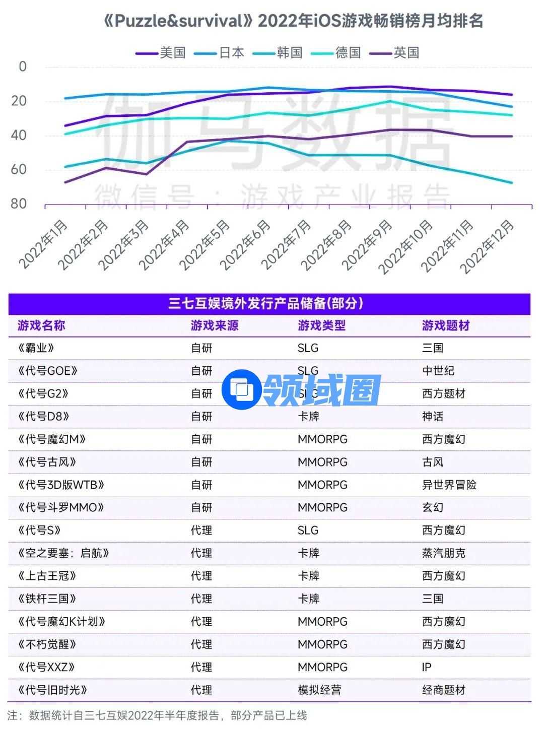 在产品海外发行上,三七互娱依据产品特性选取适合产品的市场进行重点发行,再从主攻市场向海外更多市场进行拓张。旗下产品《Puzzles&survival》切中欧美市场对于SLG与消除类游戏的偏好,在针对性的推广活动作用下,产品在美、日等多个主要市场中得到快速发展,并且在2022年保持增长趋势,成为三七互娱的海外营收主力。