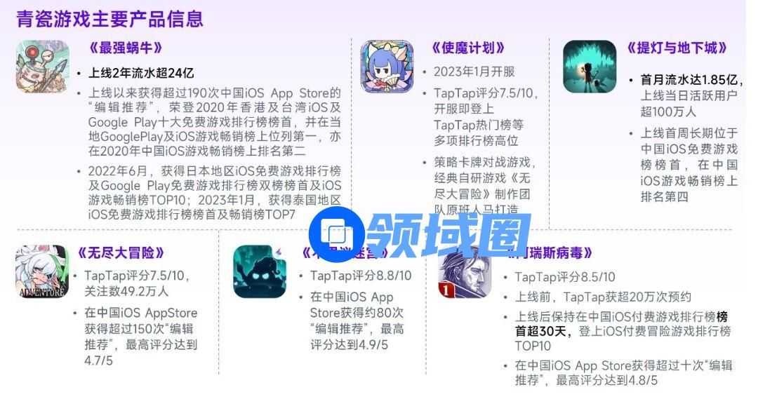 2022年6月青瓷游戏携旗下主力产品《最强蜗牛》正式进入日本市场,迈出了青瓷游戏拓展海外移动游戏市场的关键一步。《最强蜗牛》在日本上线后获得了日本地区iOS和Google Play免费游戏榜的双榜冠军,并长期位列日本iOS游戏畅销榜TOP100,在发售后的两个月内共实现流水近7000万元。随后《最强蜗牛》又正式于2023年1月在泰国推出,并顺利登顶泰国iOS免费游戏榜,同样取得了亮眼成绩。《最强蜗牛》的成功出海,在证实青瓷游戏出海能力的同时,也让青瓷游戏积累了海外发行经验,为后续扩大海外产品矩阵打下基础。此外,自研游戏储备《使魔计划》已于2023年1月开服,《时光旅行社》也即将上线,IP储备不断扩充。青瓷游戏2022年中期报告显示,青瓷游戏将继续通过组合不同类型游戏产品来拓展“青瓷宇宙”,融合各IP影响力打造自身游戏品牌,综合提升青瓷品牌在玩家群体中的影响力与市场知名度。