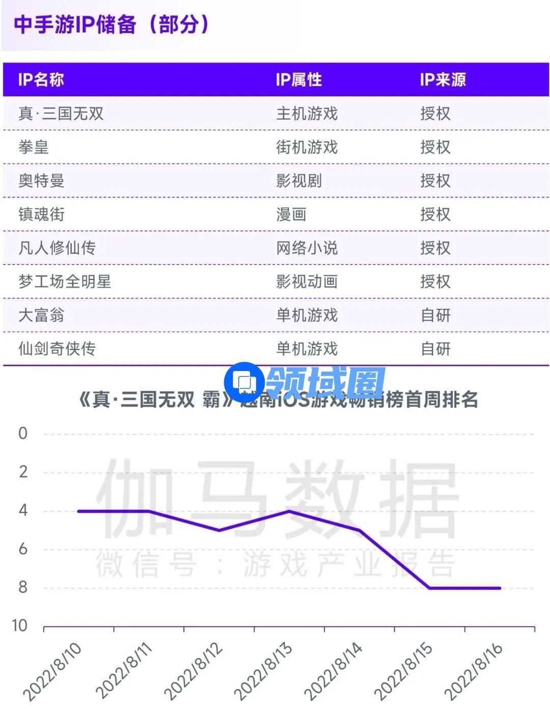 丰富的IP资源一直是中手游核心竞争力之一,通过获取国内外知名IP,结合中手游日渐增强的自主研发能力,向全球移动游戏市场推出各大IP产品,继而构建中手游自身IP游戏生态。现阶段中手游已取得“真·三国无双”“拳皇”“奥特曼”等多个在全球范围内具备较高知名度的IP授权,所研发的IP产品也开始陆续向市场推出,2022年8月,《真·三国无双 霸》在东南亚多个地区正式推出后得到良好反响,并取得越南、菲律宾iOS免费榜第一,首周维持畅销榜TOP10的亮眼成绩;此外,基于“拳皇”IP研发的移动产品《全明星激斗》于11月在国内率先上线,并计划于2023年Q1向海外市场推出。《全明星激斗》在中国市场推出后连续三天位于iOS免费榜第一名,首周流水超过5000万元,随着产品进入海外市场,“拳皇”IP的影响力将得到进一步释放,成为中手游海外市场拓展的重要助力。
