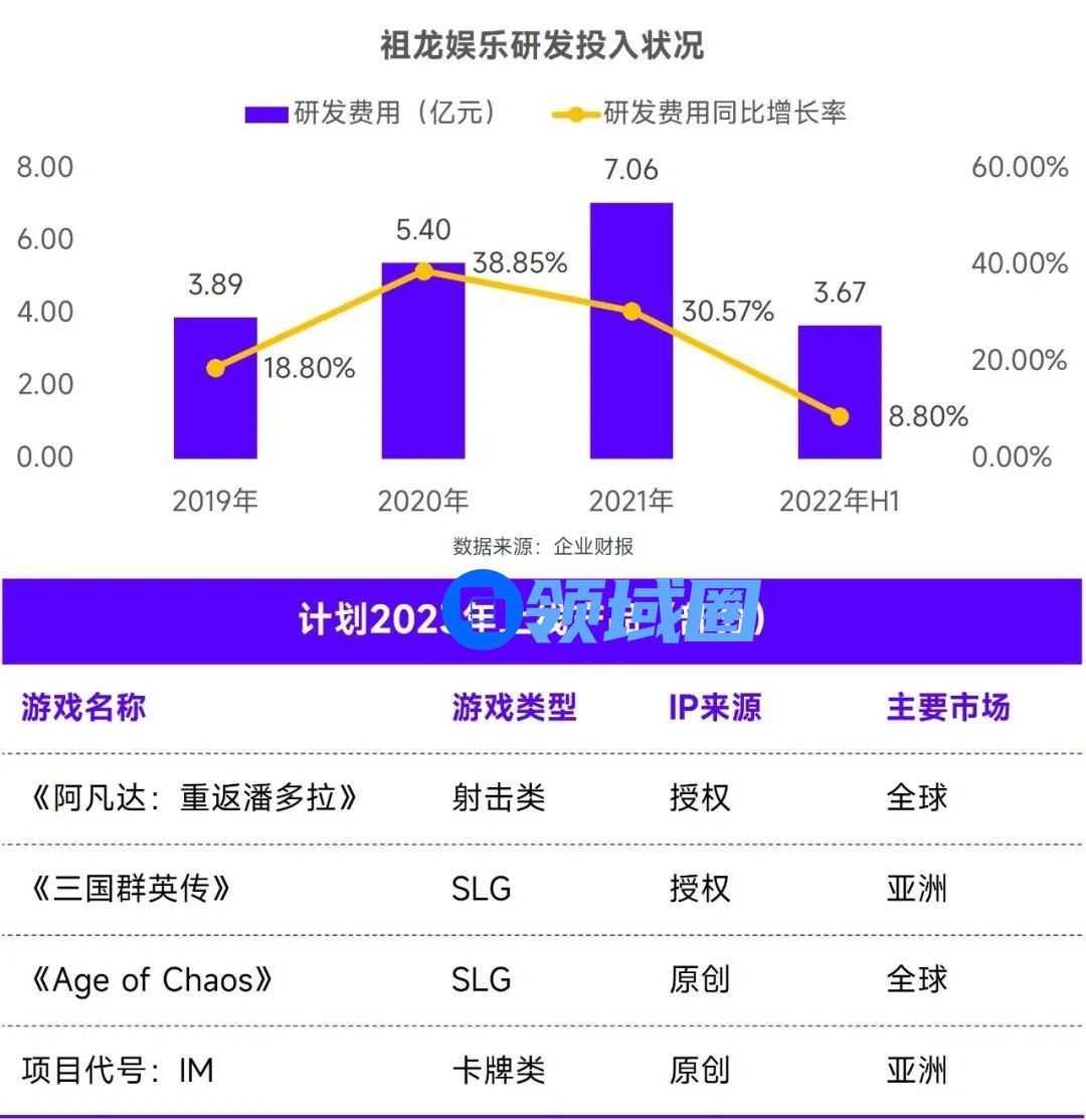 近年来,祖龙娱乐在旗下在运营主要产品流水出现自然衰减的情况下,仍能保持增加对产品研发的投入,展现出了祖龙娱乐对研发端的重视以及对自身研发能力的信心,而新品上线后取得的优异成绩也正是各地市场对祖龙互娱研发实力的肯定。未来祖龙娱乐在加深自身垂直领域优势的同时,也将继续加强自身产品品类多元化发展,当前在研产品类型中,除祖龙娱乐已取得优势的MMORPG、SLG、女性向游戏外,还包含射击、卡牌等多个品类游戏,品类的多元化发展或将为祖龙娱乐的发展带来更多可能性。