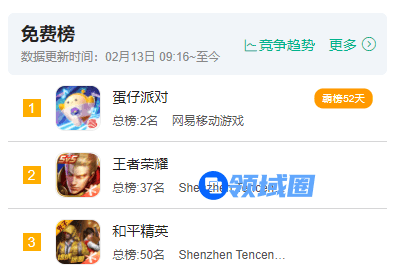 直到今天,网易自研自发的《蛋仔派对》已于免费榜霸榜52天。在2023年春节档,《蛋仔派对》更是空降收入排行前三,七天营收预估782万美元,暗戳腾讯老牌游戏后背。
