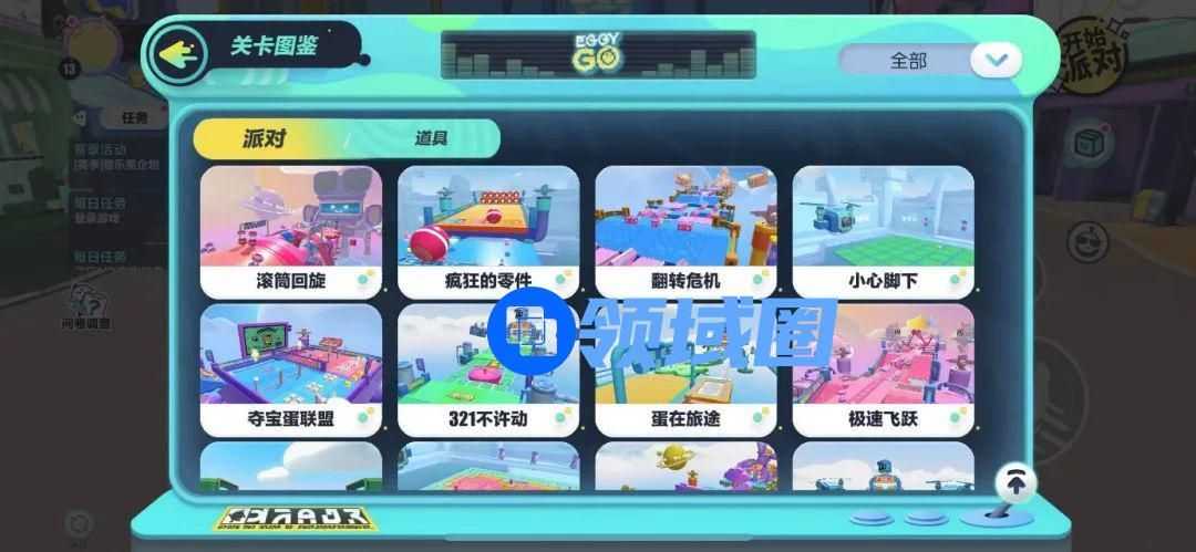 《蛋仔派对》类的派对玩法脱胎自电视闯关节目《勇敢向前冲》,主要分为大型障碍赛道竞速通关,以及不同类型的生存模式,每轮共四局,玩家需在限定时间内取得逐渐缩圈的晋级名额,赢取最终胜利。蛋仔在行进过程中要擅用丰富的道具,烟雾弹、地雷等设定,让人联想至《马里奥赛车》。除了普通派对玩法,游戏还不定期开展捉迷藏等活动,秒回童年时代。根据资料,从游戏上线开始,《蛋仔派对》共推出了六个赛季,共95张关卡地图。