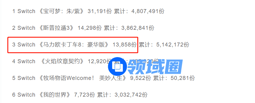 《马里奥赛车8豪华版》的畅销证明了玩家对它有多长情,推出已近6年,上周仍处于日区周销游戏第三,总销量更在2022年突破5000万份,超过《动物森友会》成为Swtich平台销量最高的游戏。