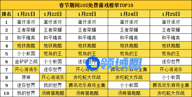 春节期间iOS免费游戏榜单情况一览,标黄为休闲类(数据来源:七麦数据)