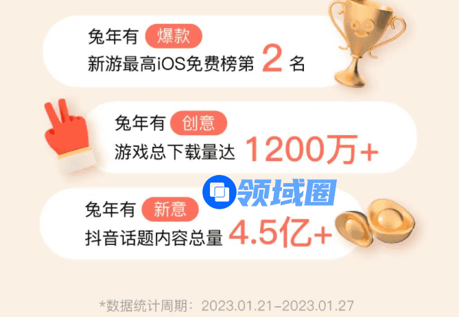 而且该游戏背后的发行商正是我们熟悉的休闲爆款大户——Ohayoo。从Ohayoo官方公布的一组数据来看,这款游戏的成功还只是Ohayoo春节档成绩单的“冰山一角”,据Ohayoo统计,在2023年春节期间(1月21日到1月27日),旗下新老产品同时发力,获得总下载量达1200万次,抖音话题内容总量也达到了4.5亿。