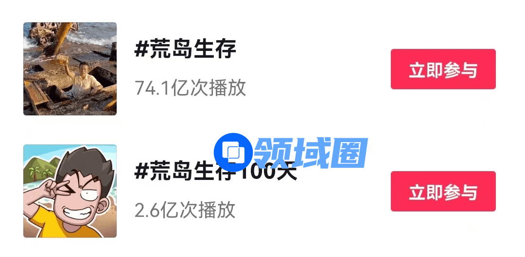 在确定了合作IP的同时,Ohayoo还在内部数据的支持下,瞄定了一个与“开心锤锤”IP高度契合的热门内容——“荒岛生存”。据茶馆观察,该话题下的短视频内容,大都是通过展示荒岛生存过程中,潜在的生存危机和可能触发的各类随机性事件,来满足观众的猎奇心理。在大量创作者的参与下,“荒岛生存”话题目前在抖音站内的播放量已经超过了74亿次。