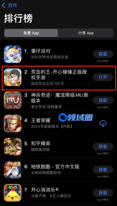 因此,榜单中难得一见的“新面孔”吸引了茶馆的注意。这款成功突破老游包围圈的新游名为《荒岛的王-开心锤锤正版授权手游》,该游戏上线于2022年12月,在上线后最高登上过iOS免费榜第2名,且从春节至今稳坐iOS免费榜TOP5。