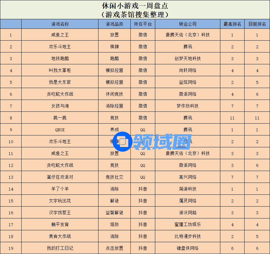 休闲新游周报每周统计微信小游戏、QQ小游戏、抖音小游戏、硬核小游戏以及App Store和Google Play上的新游爆款,并按照分类制作表格,将游戏排名情况等信息公布,希望给到行业同侪帮助。