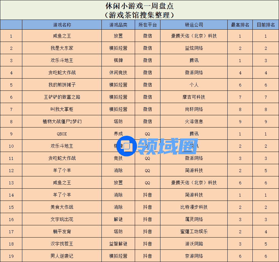 休闲新游周报每周统计微信小游戏、QQ小游戏、抖音小游戏、硬核小游戏以及App Store和Google Play上的新游爆款,并按照分类制作表格,将游戏排名情况等信息公布,希望给到行业同侪帮助。