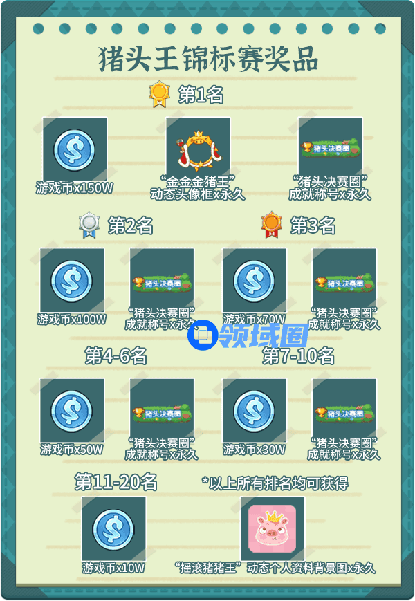只要在预选赛中完成10局比赛,无论是否获得名次,都能在比赛结束后获得“猪头王第二届锦标赛”永久纪念勋章一枚!