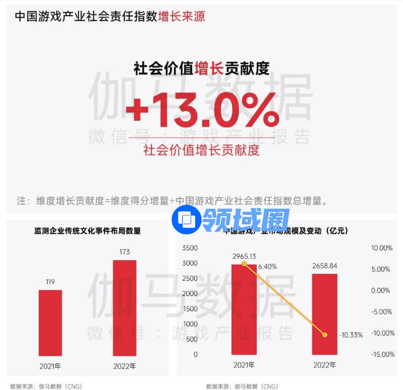 社会价值指产业可为社会发展提供的价值,助力社会发展是每个产业均具备的基础责任,本年度社会价值对指数的增长贡献在四项维度中最小。贡献为正主要由于产业延续了对于传播传统文化的重视度,投入更多资源推动文化传播,使得相关事件数量大幅增加;同时,“游戏+”等领域布局更加深入,有助于从更多层面挖掘游戏社会价值,二者综合作用提升了贡献度。但整体贡献较小主要是由于市场规模下降引起较多负面反应,例如产业普遍出现的裁员、福利削减等现象。