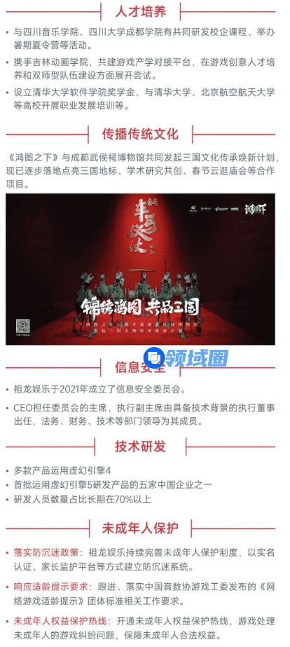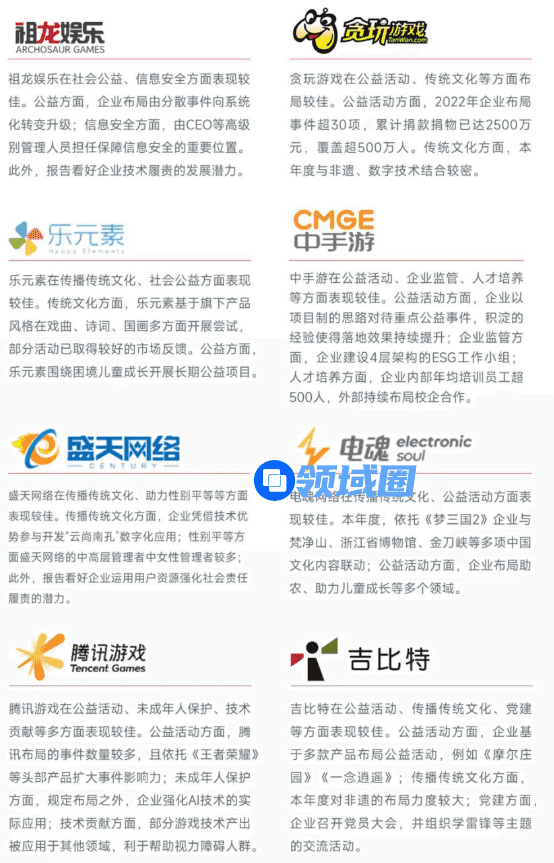 祖龙娱乐通过公益活动、人才培养、信息安全等方面履行社会责任,同时伽马数据看好企业技术履责的发展潜力。公益活动方面,企业布局逐步由分散事件向体系化转变升级,例如2022年度开启了“龙行公益”计划,除新增公益项目外,还对原有的“鸿鹄筑梦公益计划”进一步整合,展开更为丰富的公益活动,这也意味企业将有计划的长期投入到公益领域;人才培养方面,祖龙娱乐与多所高校开展合作项目,以校企合作的形式着力于游戏创意人才的培养;信息安全方面,祖龙娱乐重视度较高,由CEO等高级别管理人员担任重点岗位;技术履责已通过游戏精品化、提升海外知名度等方式有所产出,但祖龙娱乐即使在头部企业中也位居前列的研发人员比重以及在AI等领域的成果产出,具备承担更多社会责任的可能性。综合本年度表现,祖龙娱乐的社会责任布局已更为全面,并呈现出深入、可持续的履责趋势。