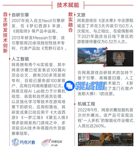网易游戏社会责任践行体现在技术赋能、积极传播传统文化等方面。技术赋能表现在强化研发自主创新,并依托先进技术不断推动数实融合发展上。具体而言,网易游戏的研发自主创新主要以游戏相关技术为核心,在以自研引擎为代表的多个精尖端技术领域展开持续投入,进而提高自身的研发能力,并推动游戏科技的进一步发展,目前网易游戏在人工智能、VR、AR、云游戏、区块链等领域多项技术实力位居国内头部;数实融合则在文旅、机械工程等社会层面具备实际需求的领域发挥作用,进而深度挖掘游戏产业更多的产业价值、社会价值。传播传统文化方面,企业保持高布局力度,本年度相关事件达数十件。经过多年投入,网易游戏已将传统文化与产品研发、运营深度结合,沉淀了丰富的策略和形式,有效提升了在传统文化领域的布局影响力与布局效果。此外,网易游戏在信息安全、人才培养、社会公益等方面也持续推进,深度履行社会责任。