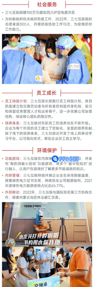 在社会责任领域三七互娱长期投入,并重视可持续发展,2022年在社会支持、环境保护、公司治理等ESG理念的细分层面取得更为成熟的社会责任成果。在社会支持层面,三七互娱通过公益事业布局乡村振兴、人才培养、科技创新等领域,对于社会自然安全以及特殊人群也较为关注,同时着手网络安全项目,以宣传、功能游戏等方式为产业提供布局参考;在环境保护层面,三七互娱响应国家“双碳”目标战略部署,企业内外多举措践行“环保、低碳、绿色、文明”观念;在公司治理层面,赋能外部人才的同时,在企业内部三七互娱持续迭代员工激励机制、优化培训体系等,帮助员工建立更为清晰的职业发展规划。