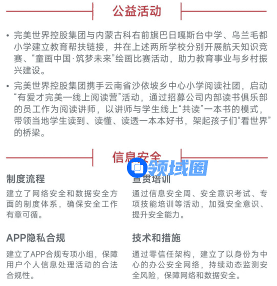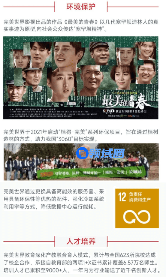 完美世界在数实融合、环境保护等方面持续履行社会责任,同时得益于多元的业务体系,完美世界围绕垂直领域的履责成果通常更为全面。在数实融合层面,近年来基于数字技术提升文化产业发展效果受到国家层面的重视,完美世界也依托于自身的技术积累和文化产品研运经验持续布局这一领域,将现实文化与数字内容有机结合,在游戏、文旅、数字人等细分领域均产出了代表性成果,有效推动了数实融合的实质性发展;环境保护方面,完美世界注重绿色可持续发展,通过影视、环保项目等方式调整自身工作布署,并向公众传播绿色发展理念;人才培养方面,完美世界教育深化产教融合育人模式,现阶段校企合作的院校数量已达数百所,一年内为产业输送近千名创新人才;此外,完美世界在公益活动、信息安全等领域也取得进展。